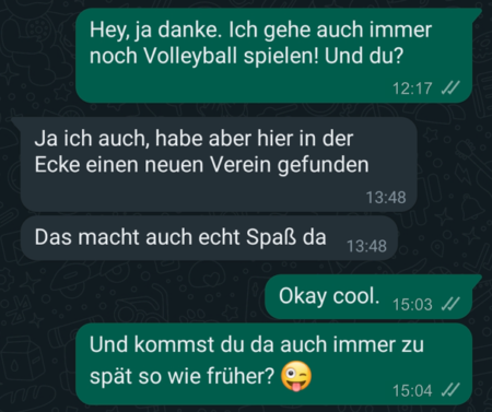Nun noch einige Infos zu den einzelnen Bausteinen anhand des Beispiels in der Grafik: Die Begrüßung sollte kurz und formlos sein. Locker und leicht eben! Vermeide aber Floskeln wie “Na, wie gehts?”, “Na, was machst du?” etc. Dieser Baustein funktioniert gut, weil du damit vorausgreifst, wie sie sich (eventuell) fühlen wird, wenn sie deine Nachricht liest. Gleichzeitig gibst du ihr ein relativ neutrales Gefühl vor (“etwas komisch” ist viel neutraler als “total strange”), sodass sie selbst weniger nachfühlen muss, ob es ihr nun gefällt, dass du ihr schreibst oder nicht. Hier darfst du Emotionen gern mit Worten wie entkräften, um nur eine kleine emotionale Tendenz vorzugeben. Ziel ist, dass du sie bestätigst und sie sich denkt “ja das ist echt etwas komisch, aber gut wenn er das auch so sieht”, was wiederum direkt das positive Gefühl eines “gemeinsamen Empfindens” hervorruft. Hier “rätst” du natürlich, wie sie dir gegenüber empfindet, was ein gewisses Risiko in sich birgt falsch zu raten. Aber solange du keine allzu krassen oder übertrieben positiven Gefühle “wahrsagst” kann kaum etwas schief gehen. Zu übertrieben wären z.B. Wahrsagen wie: Lass das auf jeden Fall sein! Es gilt: Wenn du lieber etwas vorsichtiger “wahrsagst”, dann hat sie immer noch die Chance zu sagen Nein, ich freue mich sogar ein bisschen, dass du dich meldest Wenn du aber schon etwas viel zu krasses voraussetzt, dann ist die Chance, dass sie sich sagt Naja so krass fühle ich mich jetzt auch nicht… sehr viel höher – was am Ende negative Gefühle hervorruft. Dieser Baustein kommt aus dem NLP (Und könnte daher als eine “Technik” bezeichnet werden) und ist nicht zwingend erforderlich, aber hat eine extrem gute Wirkung wenn er richtig genutzt wird. Dieser Baustein soll das Bild einer schönen gemeinsamen Erinnerung in ihren Kopf zaubern und dabei gute Gefühle auslösen. Es ist das Herzstück deiner ersten Nachricht beim Ex Anschreiben und daher solltest du dir etwas schönes einfallen lassen! Drei Elemente eignen sich hier meiner Meinung nach Perfekt: Sie lösen schöne Gefühle aus und erinnern sie gleichzeitig auch an dich – und das ohne das sie irgendetwas darauf antworten muss oder eine versteckte Erwartung dahinter steckt. Perfekt! So könnte z.B. ein Feedback zu einer Empfehlung von ihr aussehen: …Du hast mir doch damals mal empfohlen zu dieser Frau Wong in die Massage zu gehen, weil sie so unglaublich gut ist. Heute war ich da und muss sagen: es war phantastisch! Danke, dass du damals an mich gedacht hast!… Vermeide es, ans Ende deiner Nachricht eine Floskel zu hängen (so wie auch bei der Begrüßung). Hänge auch keine Frage an, sodass Sie das Gefühl hat jetzt antworten zu müssen. Lass das einfach offen und schreibe Dinge wie …wollte das einfach nur mit dir teilen. Liebe Grüße Markus …hatte da einfach gerade an dich gedacht. Liebe Grüße, Thomas Denk immer daran: Deine erste Nachricht soll eine leichte Kost sein, die gute Gefühle auslöst. Wie der erste kleine Snack nach einer langen Fastenzeit! So sahen Erstnachrichten aus, mit denen Klienten bereits Erfolg hatten: So! Nun bist du bereit deine erste Nachricht an sie zu schreiben! Und dann?